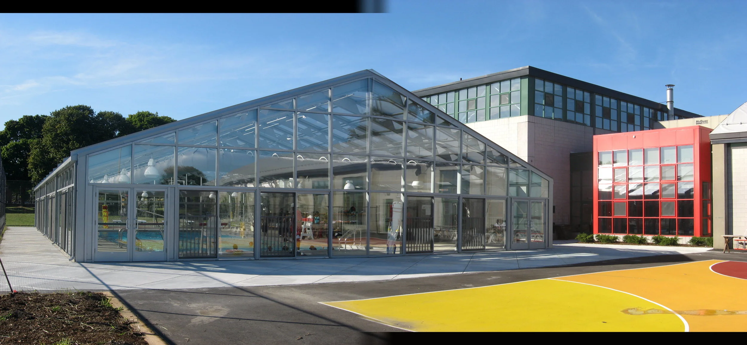 • The highlight of the new addition is a new swimming pool enclosed in an aluminum and glass atrium that has a retractable roof that allows for a year round aquatic program.